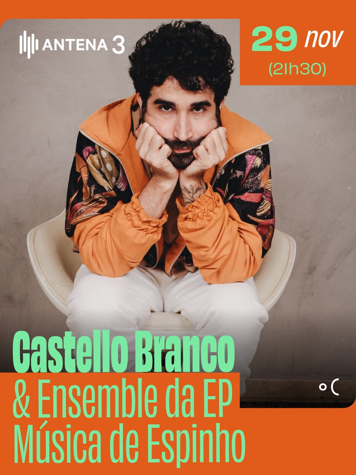 A relação de Portugal com o brasileiro Castello Branco tem já dez anos e dezenas de concertos de norte a sul em vários formatos distintos: em duo, em trio ou a solo. Desta feita, o músico nascido no Rio de Janeiro faz-se acompanhar de uma formação de cordas da Escola Profissional de Música de Espinho. Juntos, interpretarão algumas das canções mais representativas da sua já longa discografia, com arranjos escritos para o efeito. Em 2013, Castello Branco lançou o seu primeiro disco, Serviço, e imediatamente chamou para si um lugar central na nova geração da música brasileira. Sintoma (2017), Sermão (2020) e Niska (2021) confirmaram a força da sua palavra e da obra que tem vindo a construir.
