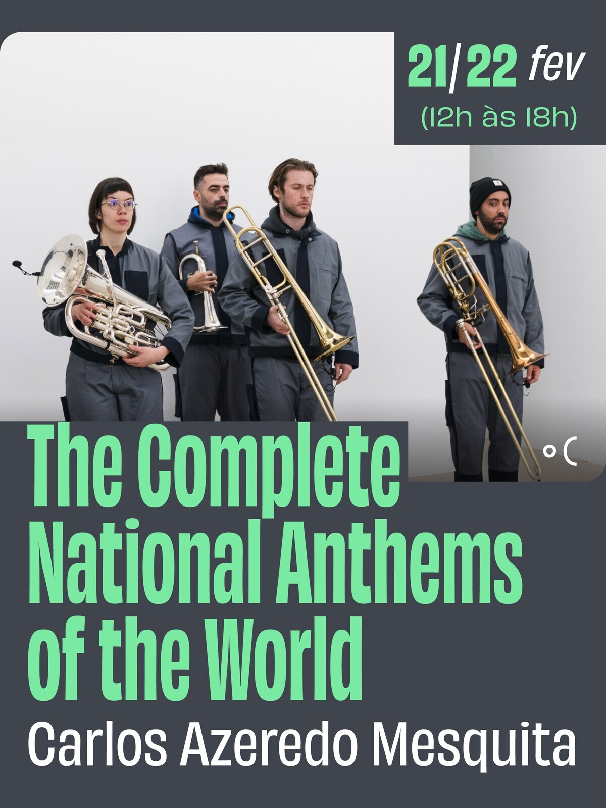 Ao longo de 12 horas distribuídas por dois dias, esta performance reúne quase 300 hinos (de países reconhecidos pela ONU, de movimentos independentistas, regiões autónomas, organizações internacionais e até estados já extintos) cantados em gravações a cappella e acompanhados por músicos de banda filarmónica que marcham e tocam. Os hinos são legendados em tempo real e acompanhados por um libretto de dimensões colossais. A peça problematiza os próprios conceitos de hino e de nação, ao mesmo tempo que ativa um sorteio de comida e bebida gratuitas, cuja oferta – pão e água ou marisco e vinho do Porto vintage – espelha as desigualdades simbólicas associadas ao poder dos passaportes no mundo global.