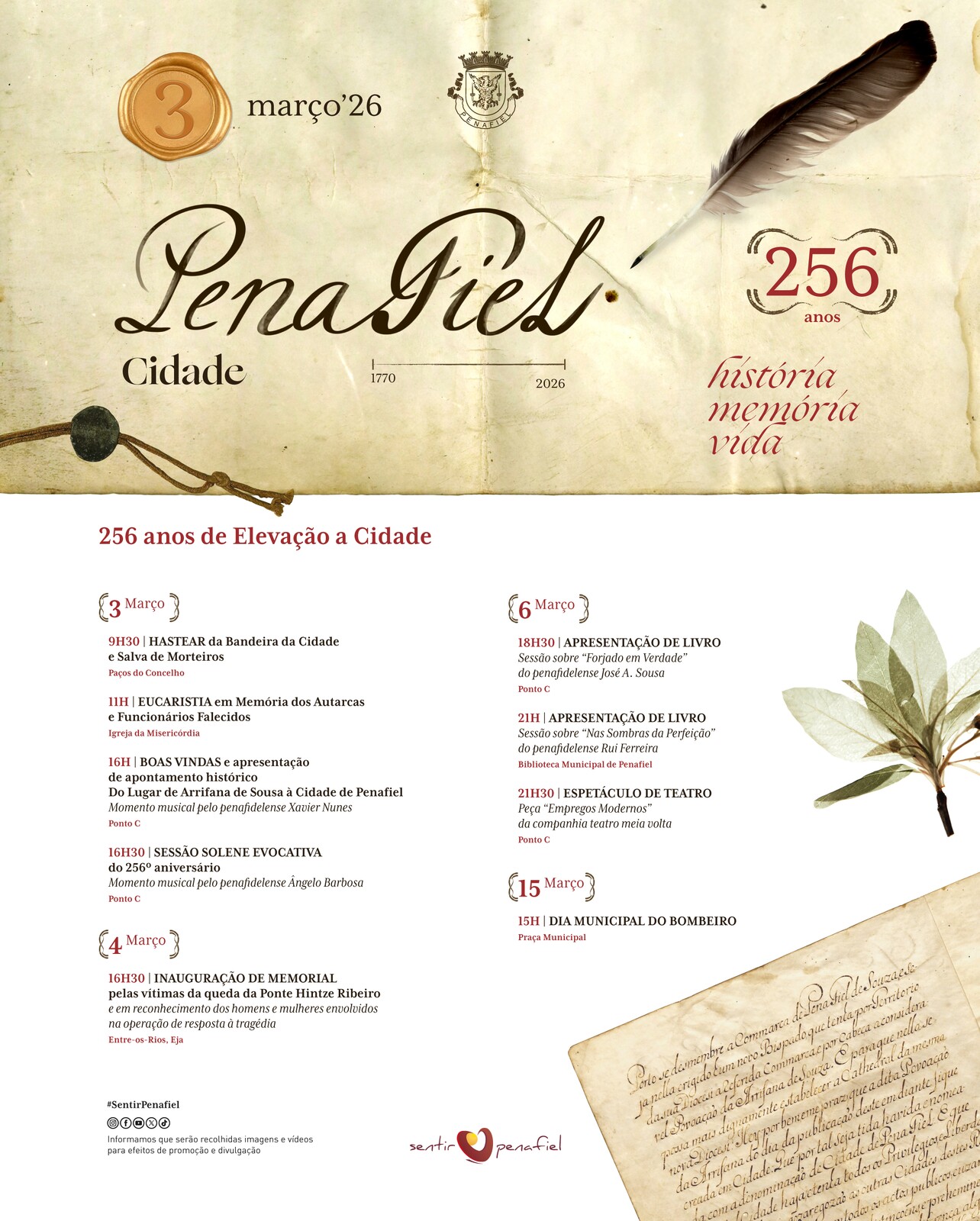 Para o Presidente da Câmara Municipal, Pedro Cepeda, “o 3 de março é um momento de identidade e de encontro com aquilo que somos. Assinalar a elevação a cidade é honrar a nossa história e, sobretudo, as pessoas que constroem diariamente o presente e o futuro de Penafiel, reconhecendo quem projeta e prestigia o nome do concelho.”